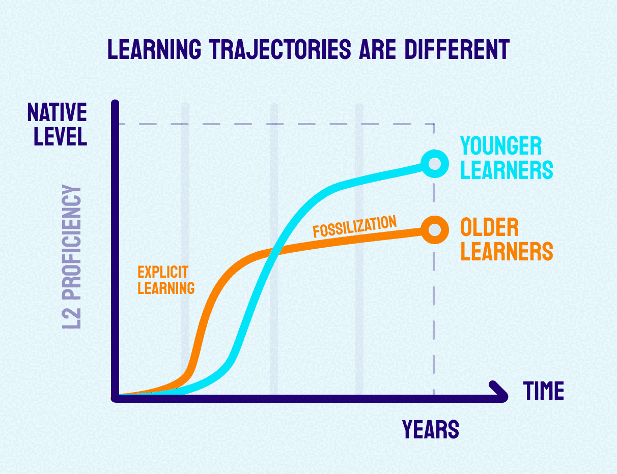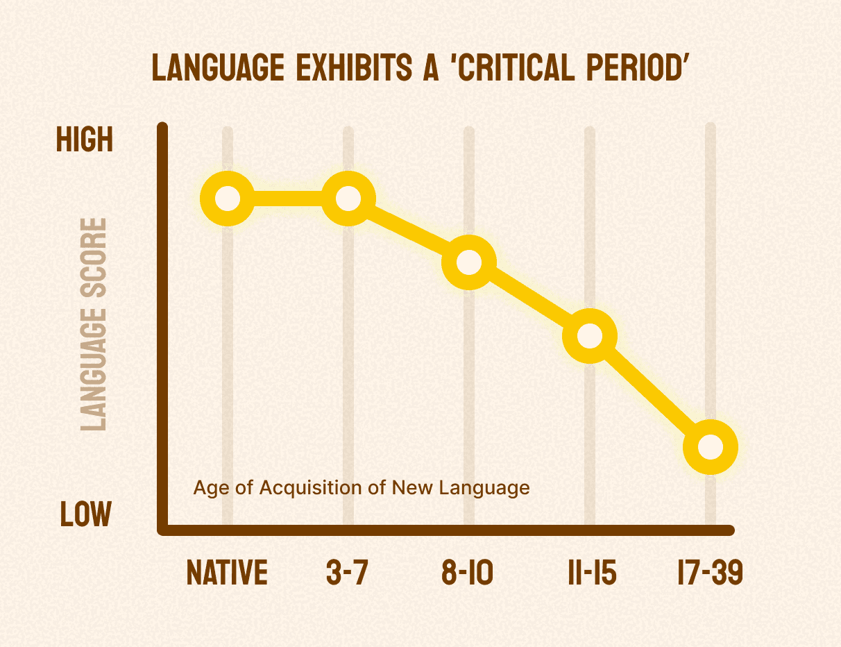 There’s a prime critical period for language acquisition. Young children’s highly plastic brains absorb new knowledge faster, outperforming older learners significantly.